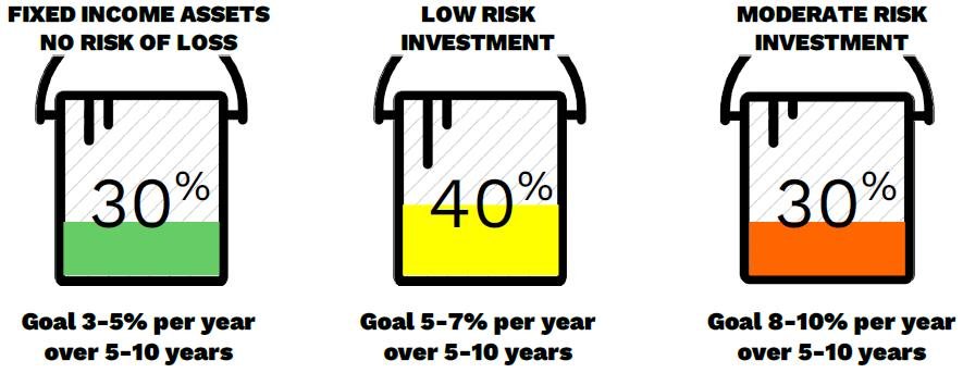 This three-bucket approach is built into the investment risk tolerance software we use. Click here If you would like to find out your personal investment risk score and fill in your own three-buckets (it takes less than five minutes):